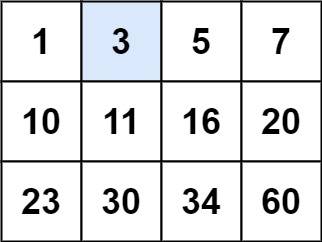 Input: matrix = [[1,3,5,7],[10,11,16,20],[23,30,34,60]], target = 3